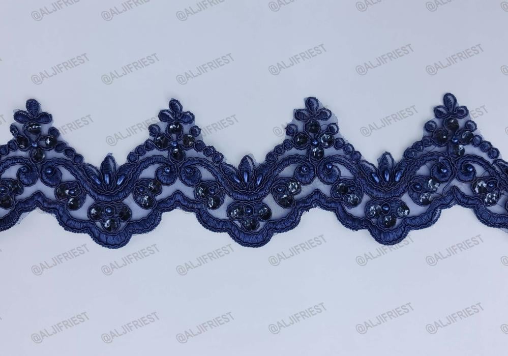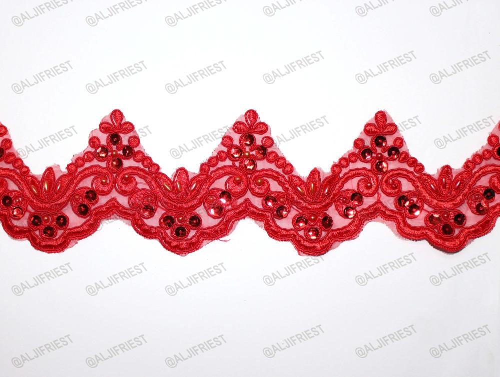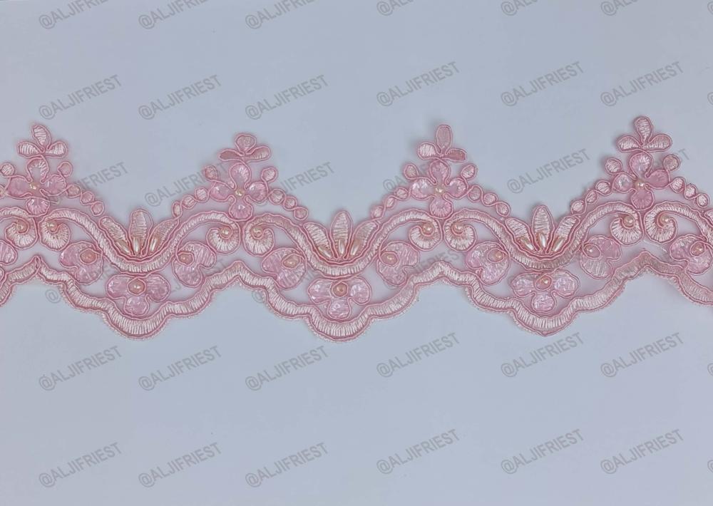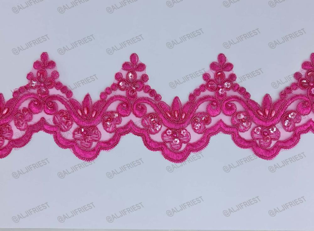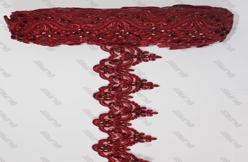 كلفة خياطة مطرزة بخيط على ارضية اورقنزة مضاف اليها شك يدوي ترتر ولولو مع تحديد بالقيطان الرفيع عرض 9سم تعبئة 12متر تقريبا متوفرة بلون: 1-جملي بسكوتي 2-عودي عنابي 3-بيج غامق 4-خربزي 5-فوشي 6-ازرق كحلي 7-وردي 8-احمر