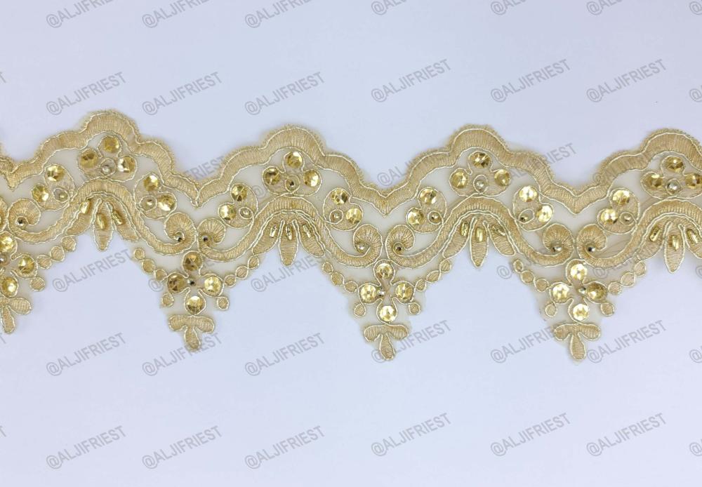 كلف تطريز بخيط ذهبي قصب على ارضية اورقنزة مع شك يدوي باللولو والترتر والقيطان عرض 10.50سم تعبئة 13متر لكل لفة